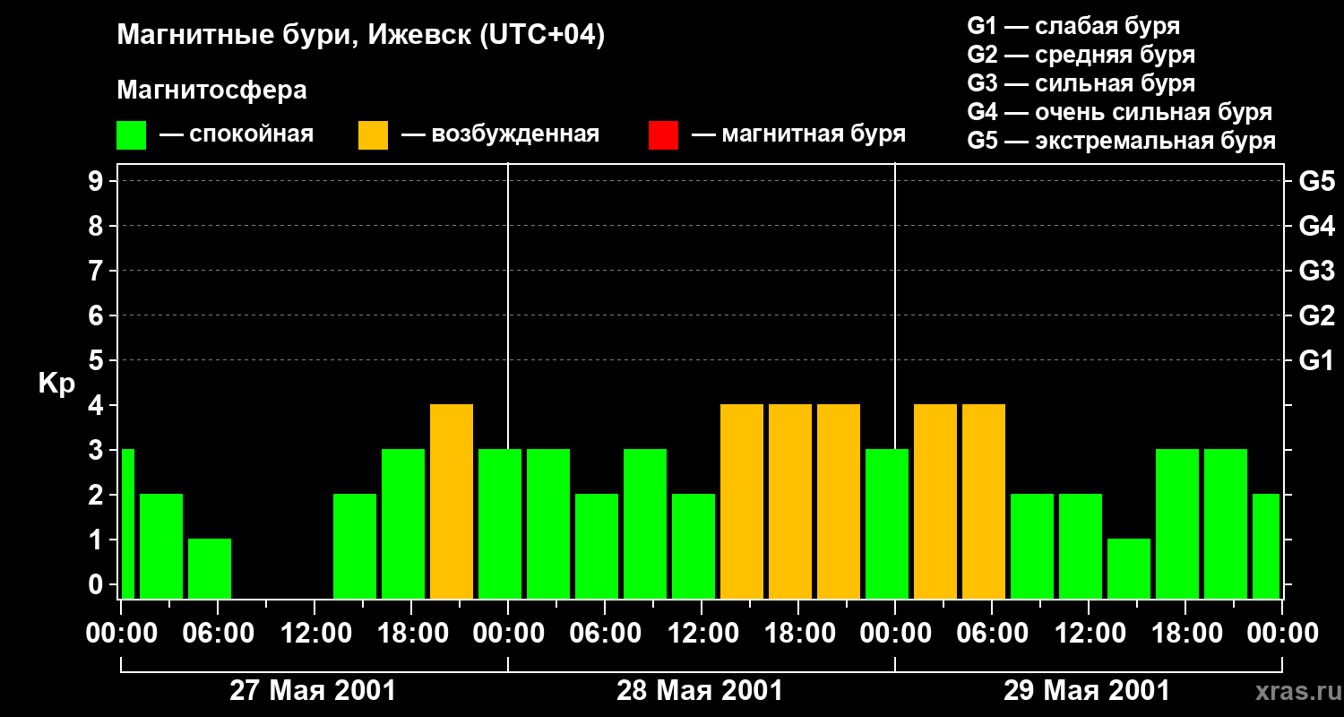 Изменения геомагнитного индекса Kp с 27 по 29 мая 2001 года для средних широт