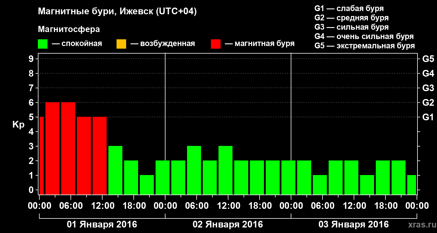 Изменения геомагнитного индекса Kp с 1 по 3 января 2016 года для средних широт