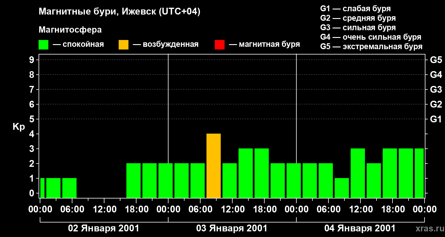 Изменения геомагнитного индекса Kp с 2 по 4 января 2001 года для средних широт