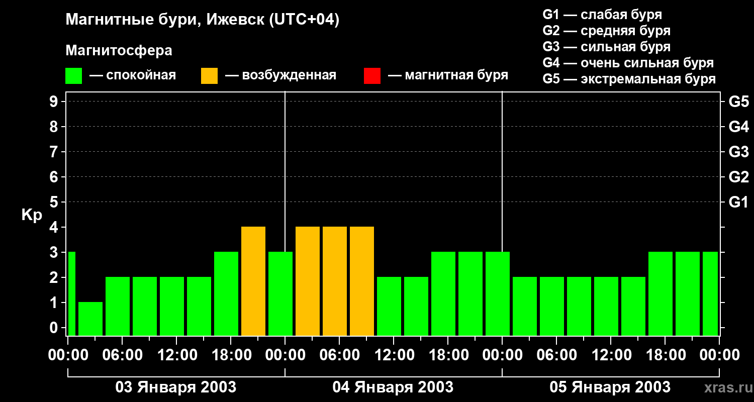 Изменения геомагнитного индекса Kp с 3 по 5 января 2003 года для средних широт