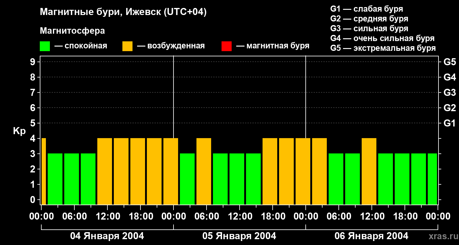 Изменения геомагнитного индекса Kp с 4 по 6 января 2004 года для средних широт