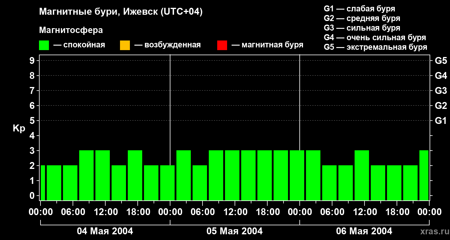 Изменения геомагнитного индекса Kp с 4 по 6 мая 2004 года для средних широт
