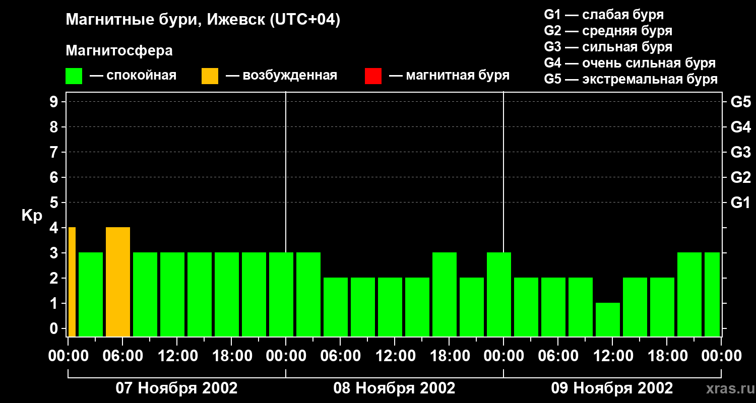 Изменения геомагнитного индекса Kp с 7 по 9 ноября 2002 года для средних широт