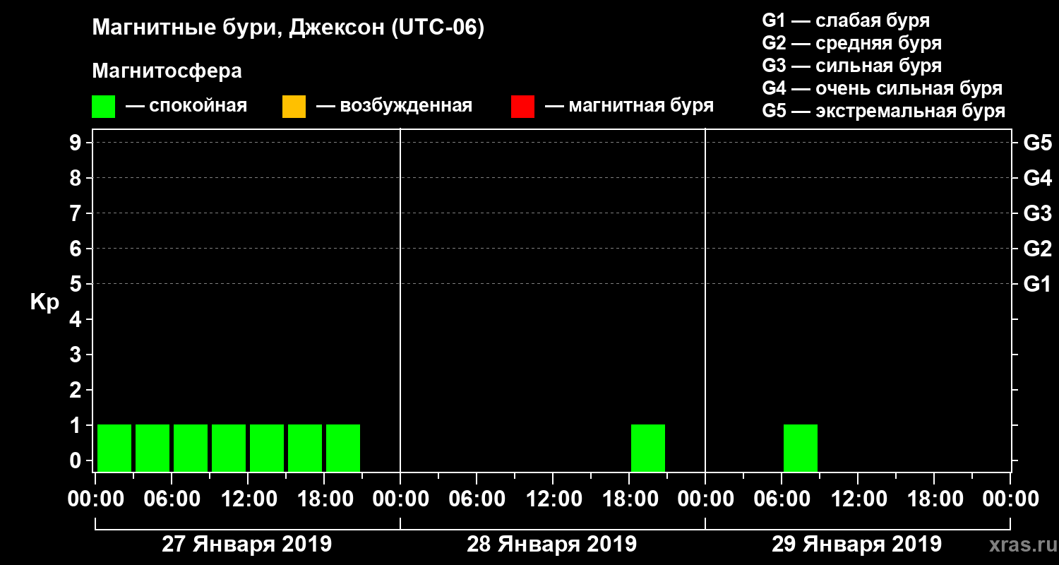 Изменения геомагнитного индекса Kp с 27 по 29 января 2019 года для средних широт