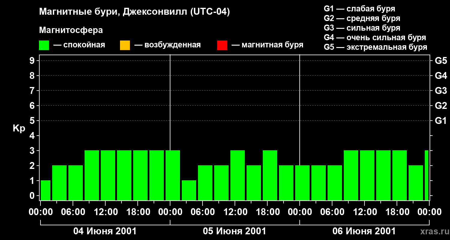 Изменения геомагнитного индекса Kp с 4 по 6 июня 2001 года для средних широт