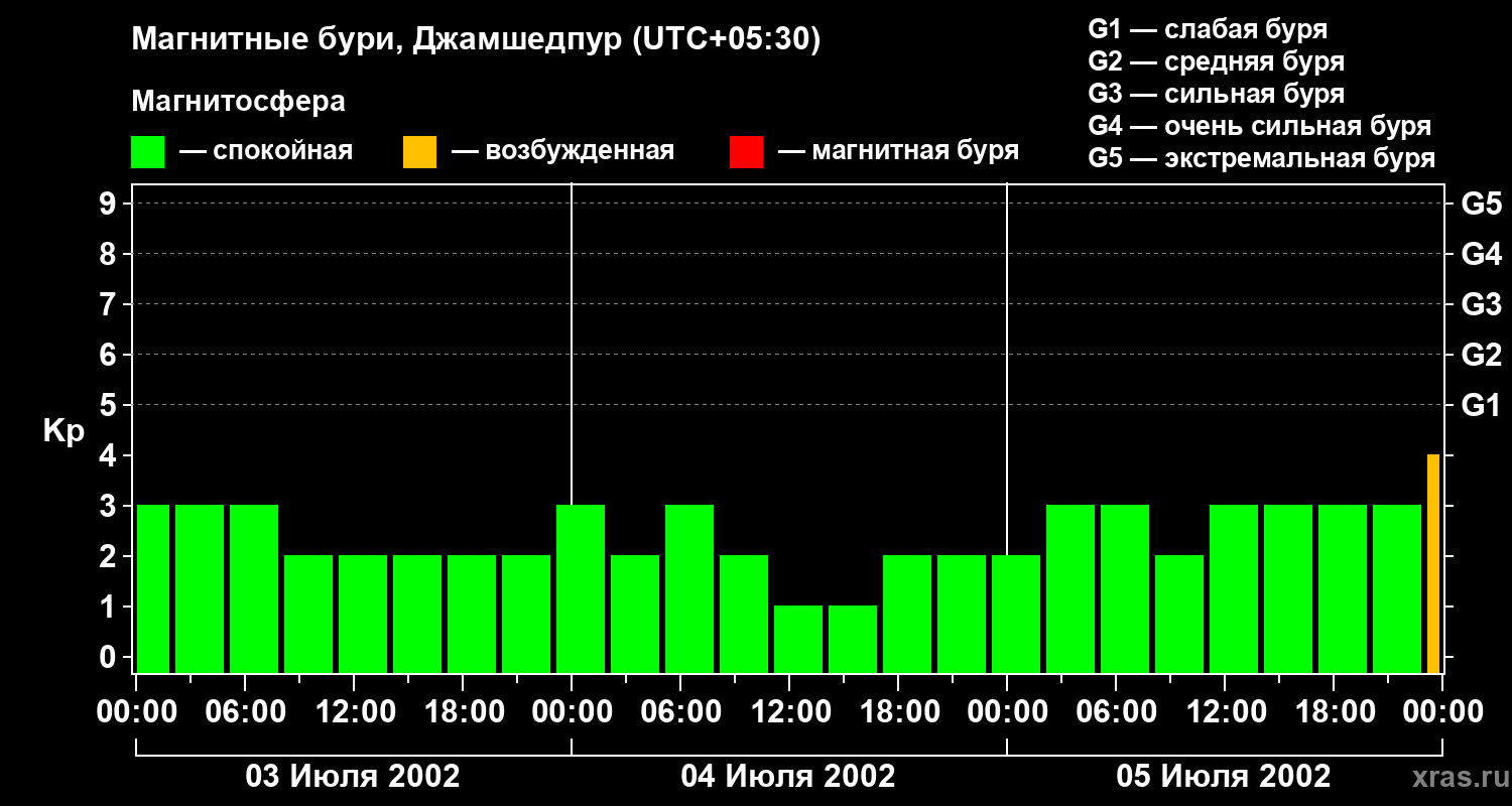 Изменения геомагнитного индекса Kp с 3 по 5 июля 2002 года для средних широт