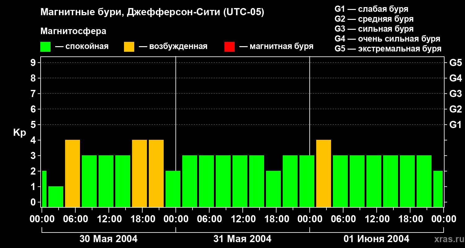 Изменения геомагнитного индекса Kp с 30 мая по 1 июня 2004 года для средних широт