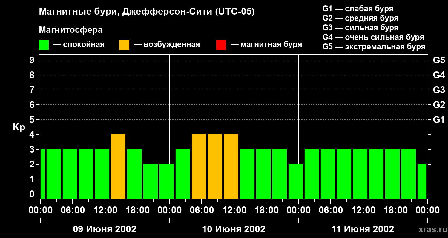 Изменения геомагнитного индекса Kp с 9 по 11 июня 2002 года для средних широт
