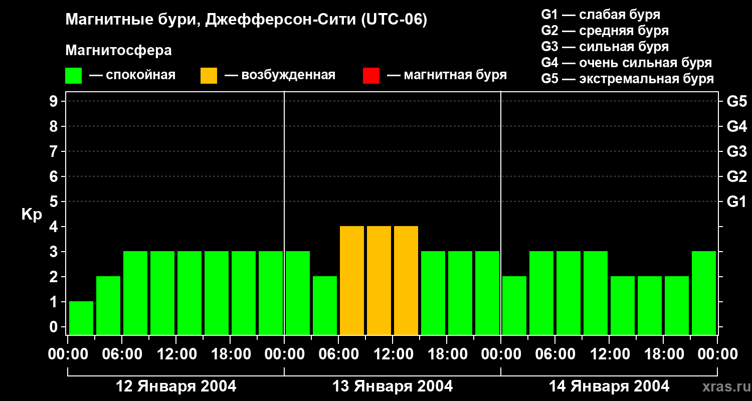 Изменения геомагнитного индекса Kp с 12 по 14 января 2004 года для средних широт