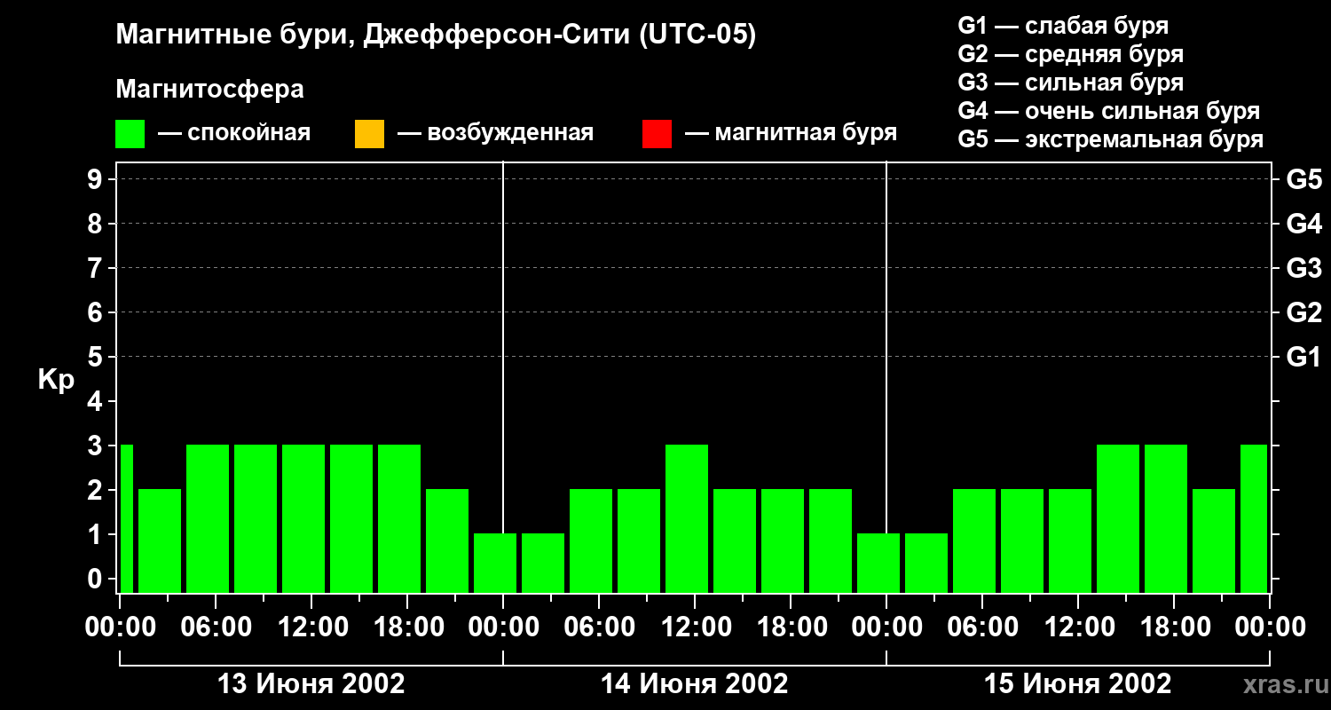 Изменения геомагнитного индекса Kp с 13 по 15 июня 2002 года для средних широт