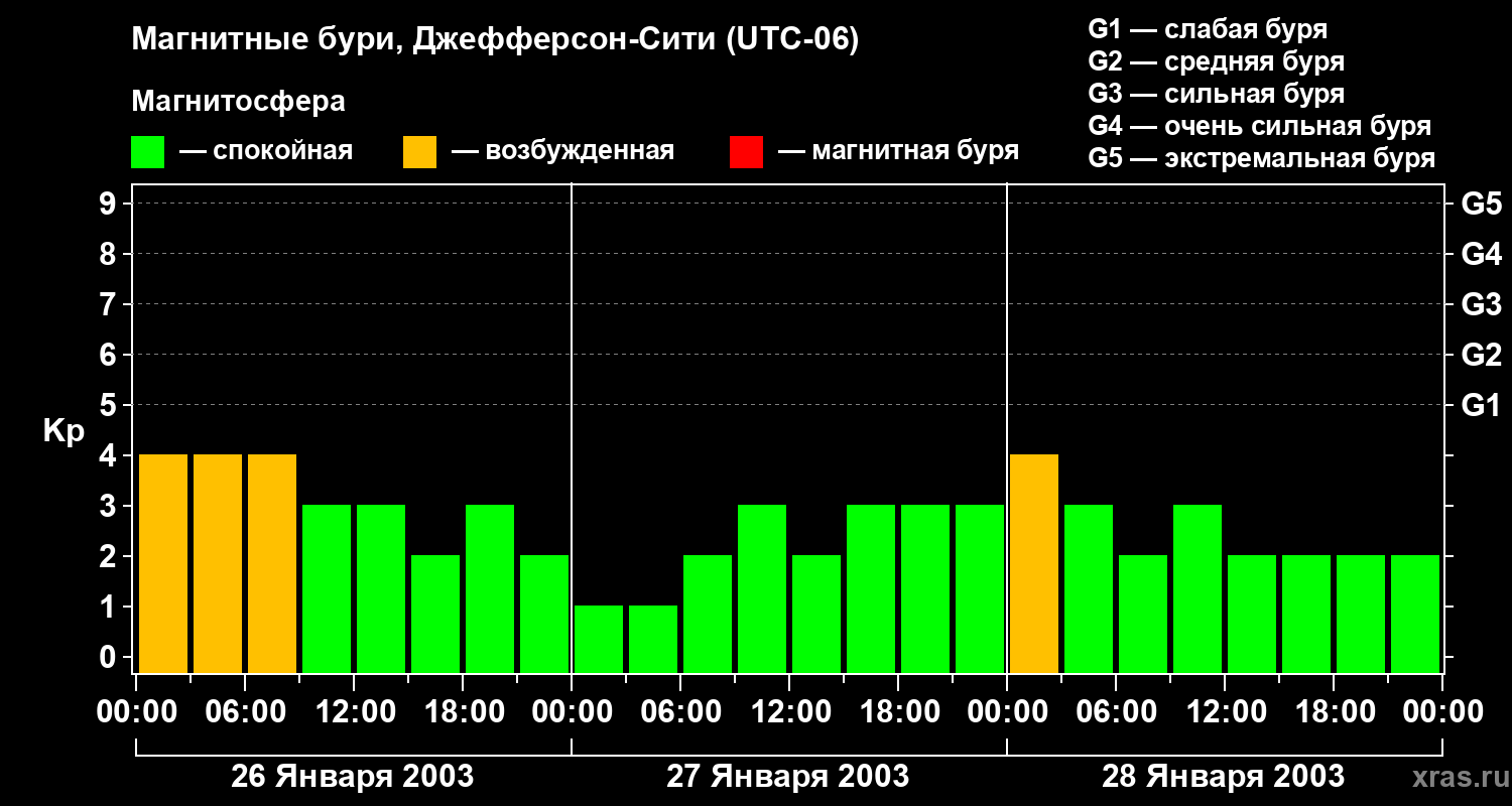 Изменения геомагнитного индекса Kp с 26 по 28 января 2003 года для средних широт