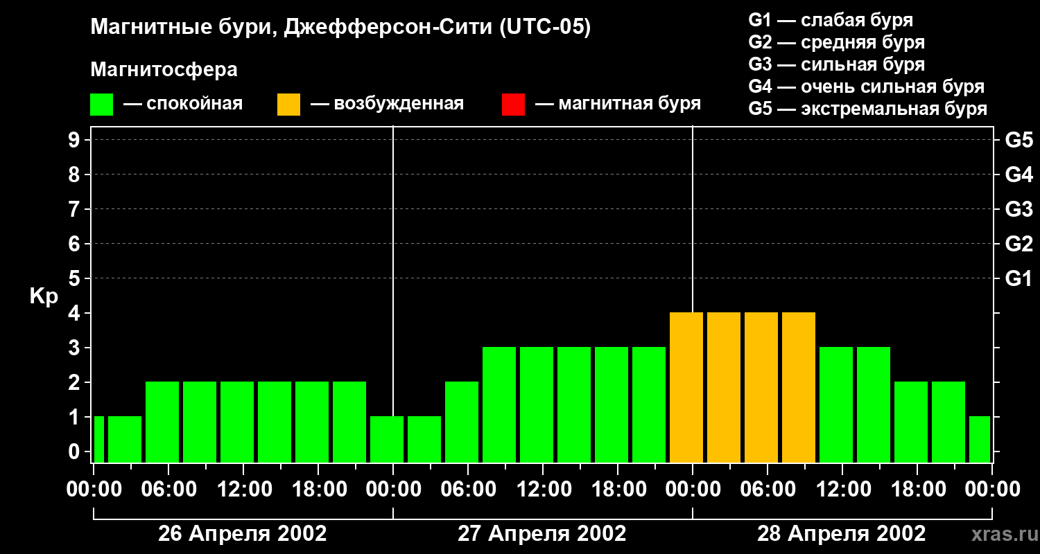 Изменения геомагнитного индекса Kp с 26 по 28 апреля 2002 года для средних широт
