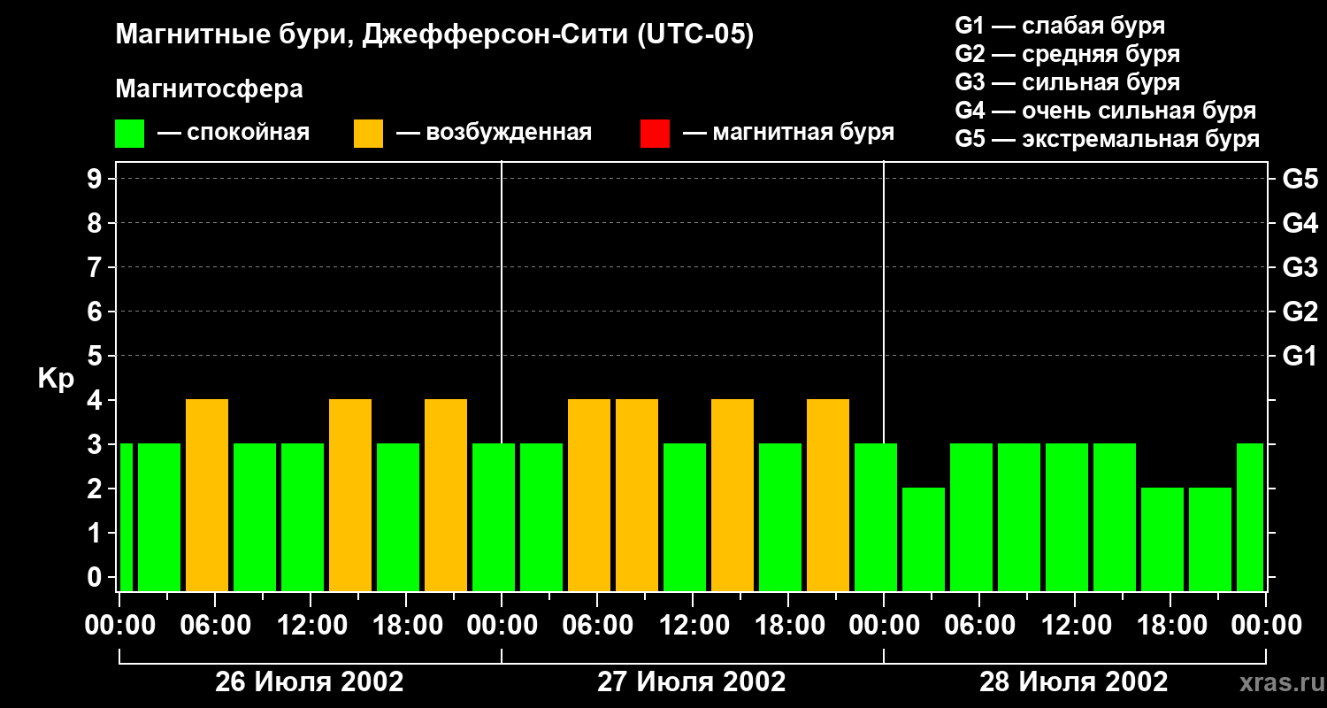 Изменения геомагнитного индекса Kp с 26 по 28 июля 2002 года для средних широт
