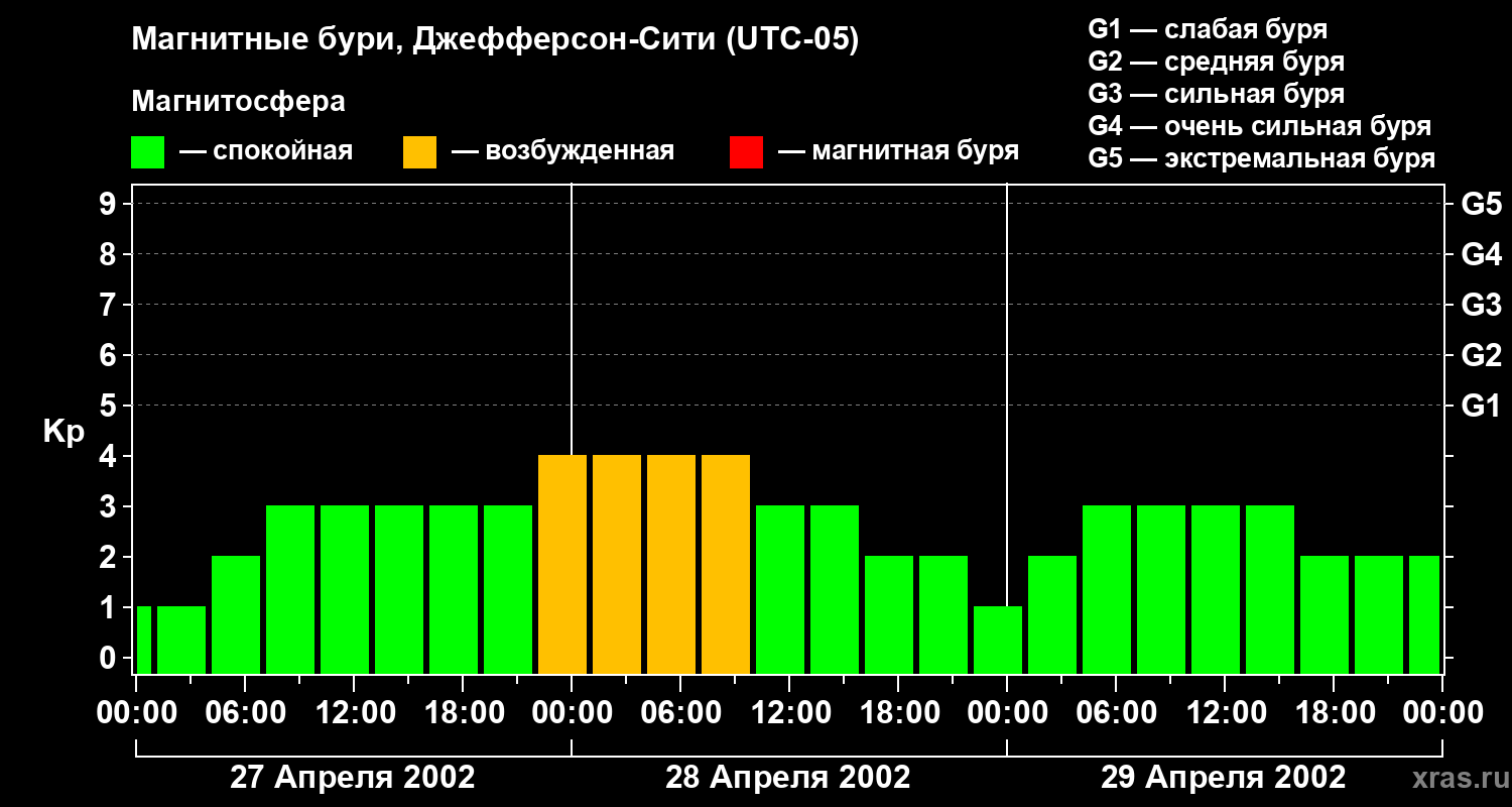 Изменения геомагнитного индекса Kp с 27 по 29 апреля 2002 года для средних широт