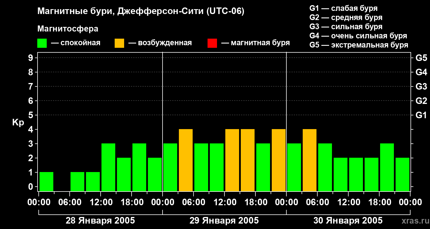 Изменения геомагнитного индекса Kp с 28 по 30 января 2005 года для средних широт