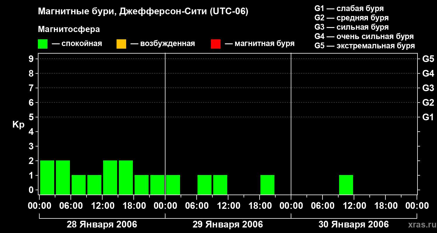 Изменения геомагнитного индекса Kp с 28 по 30 января 2006 года для средних широт