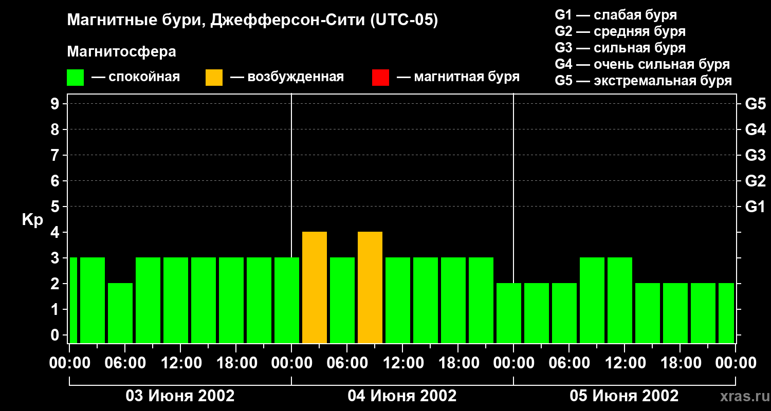 Изменения геомагнитного индекса Kp с 3 по 5 июня 2002 года для средних широт