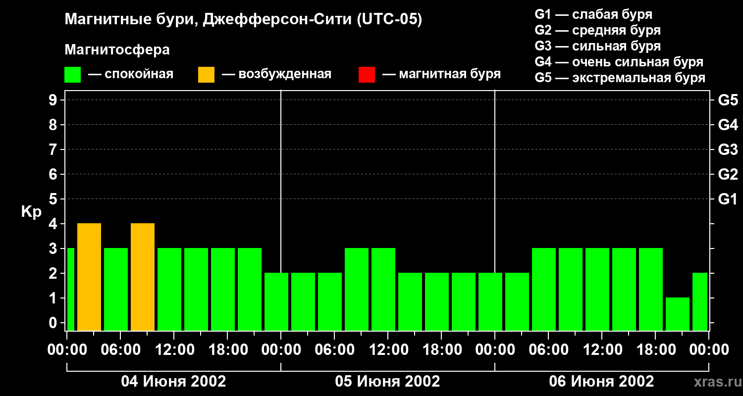 Изменения геомагнитного индекса Kp с 4 по 6 июня 2002 года для средних широт