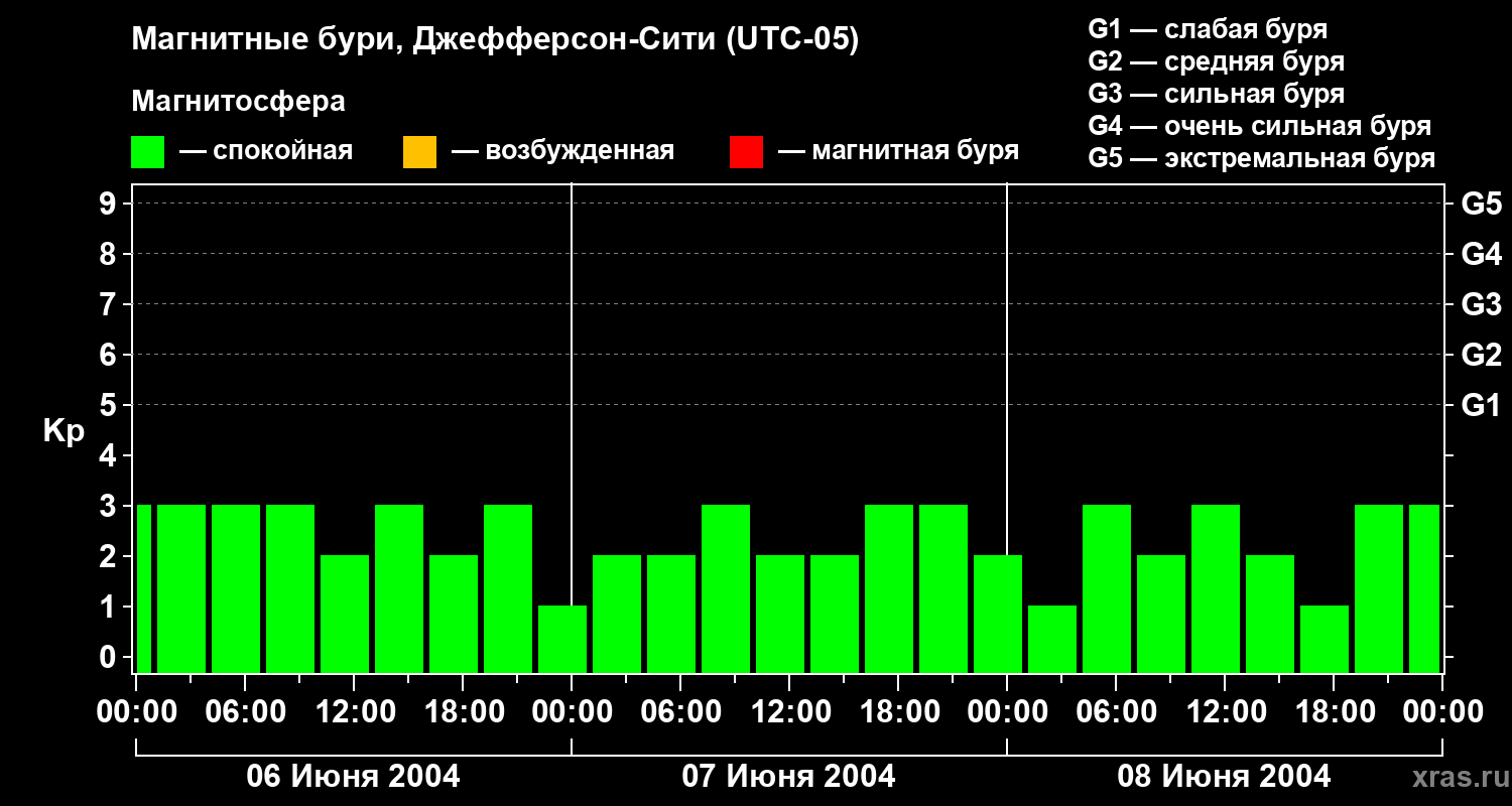 Изменения геомагнитного индекса Kp с 6 по 8 июня 2004 года для средних широт