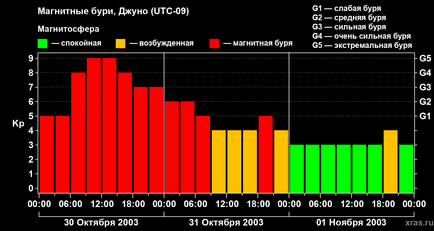 Изменения геомагнитного индекса Kp с 30 октября по 1 ноября 2003 года для средних широт