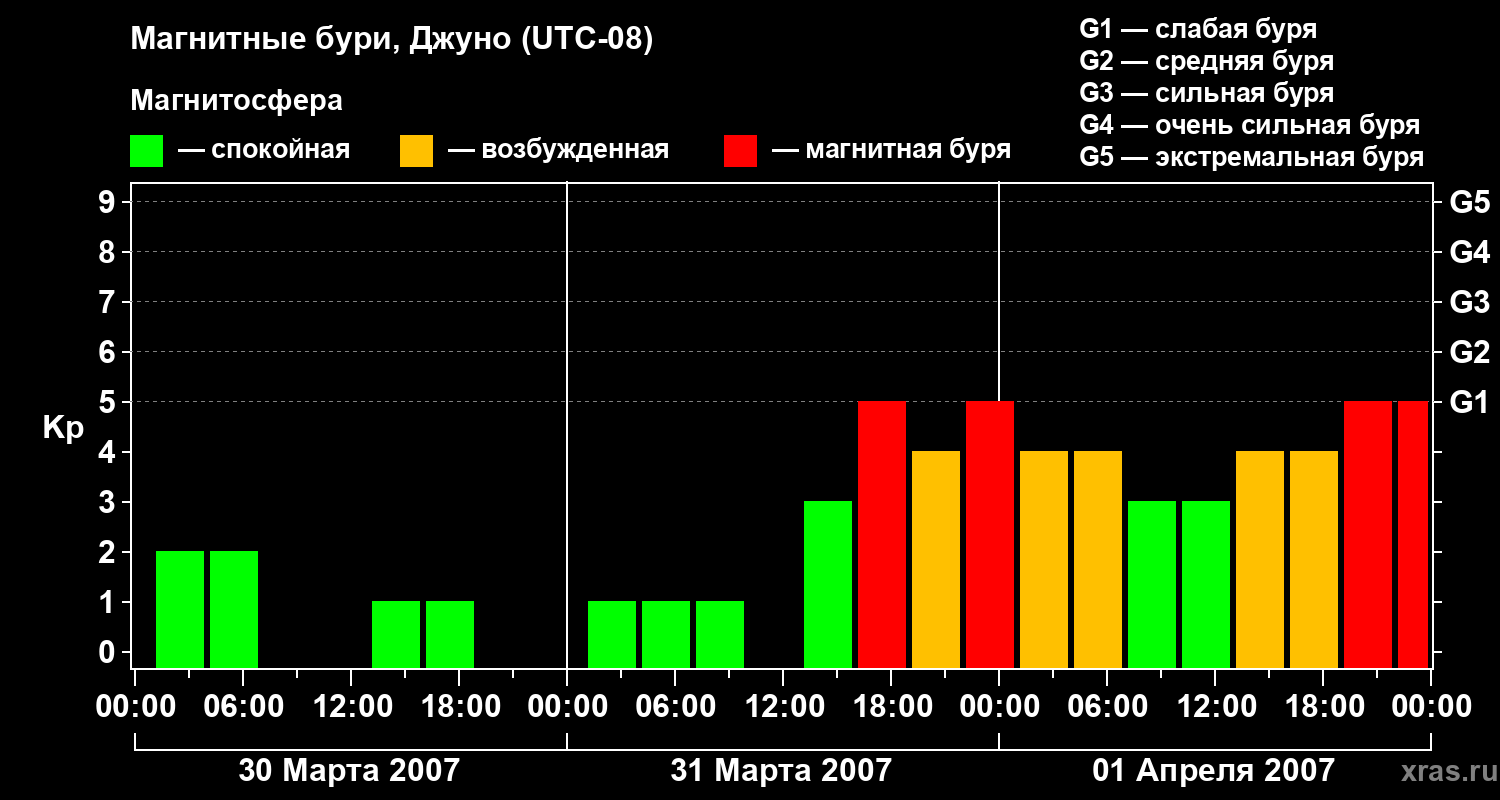 Изменения геомагнитного индекса Kp с 30 марта по 1 апреля 2007 года для средних широт