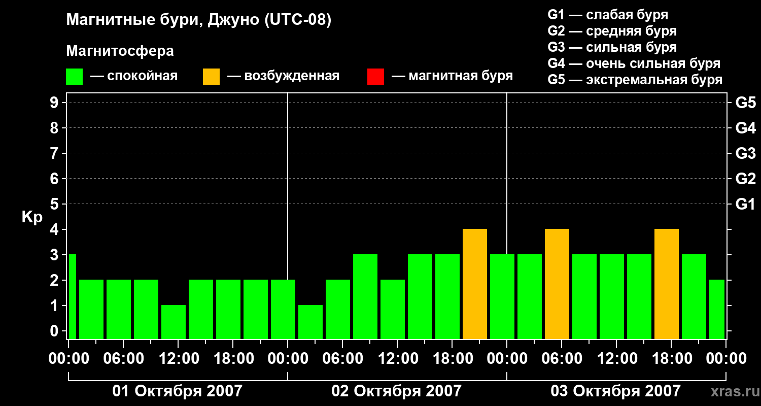 Изменения геомагнитного индекса Kp с 1 по 3 октября 2007 года для средних широт