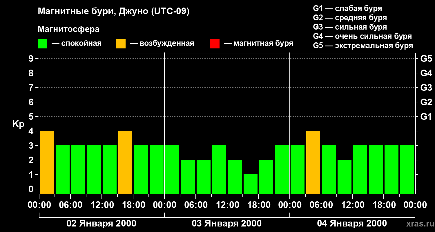 Изменения геомагнитного индекса Kp с 2 по 4 января 2000 года для средних широт