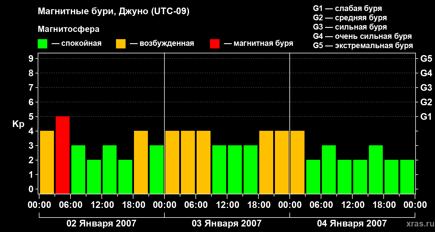 Изменения геомагнитного индекса Kp с 2 по 4 января 2007 года для средних широт