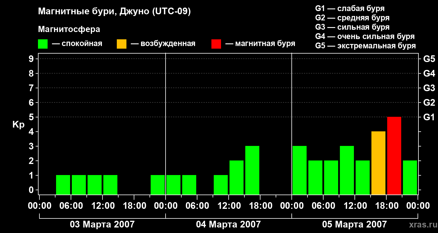 Изменения геомагнитного индекса Kp с 3 по 5 марта 2007 года для средних широт
