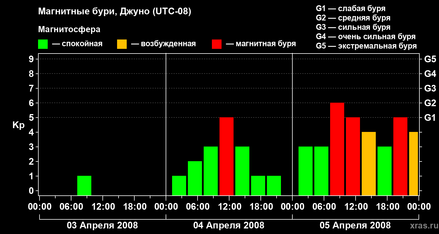 Изменения геомагнитного индекса Kp с 3 по 5 апреля 2008 года для средних широт