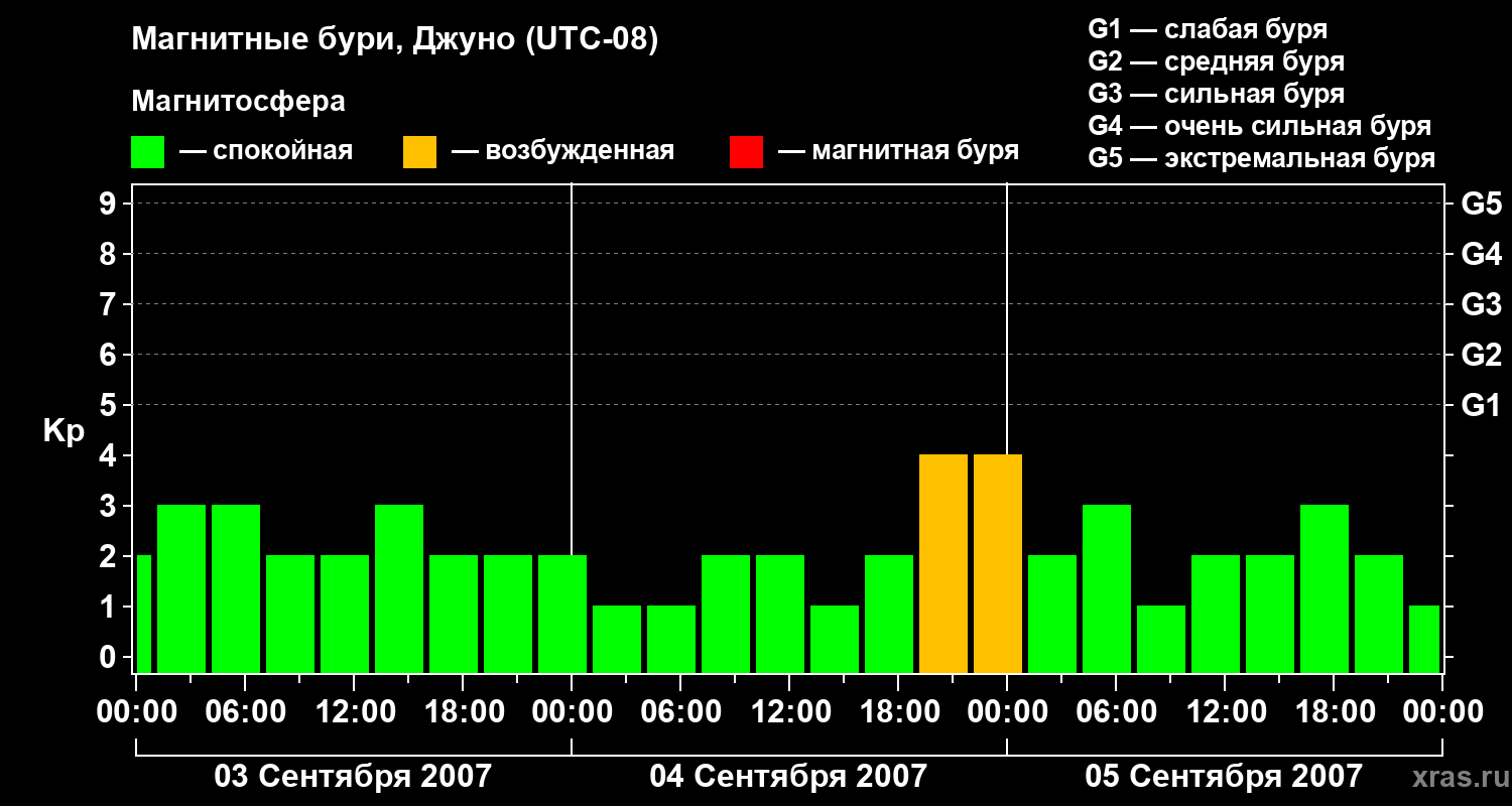 Изменения геомагнитного индекса Kp с 3 по 5 сентября 2007 года для средних широт