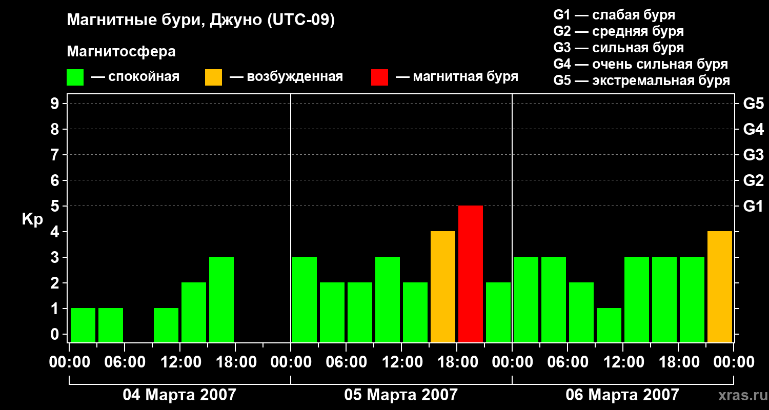 Изменения геомагнитного индекса Kp с 4 по 6 марта 2007 года для средних широт