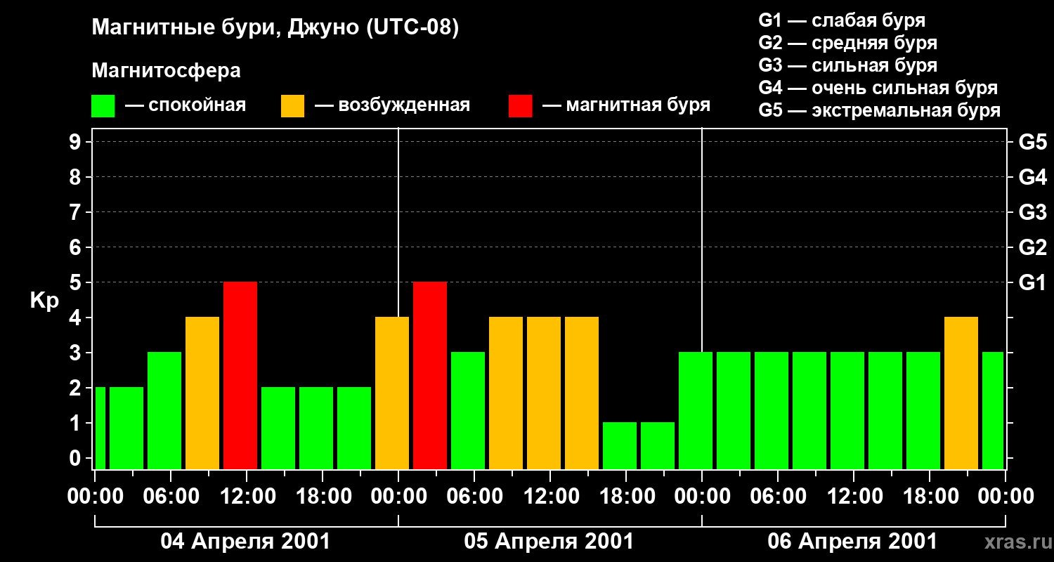 Изменения геомагнитного индекса Kp с 4 по 6 апреля 2001 года для средних широт