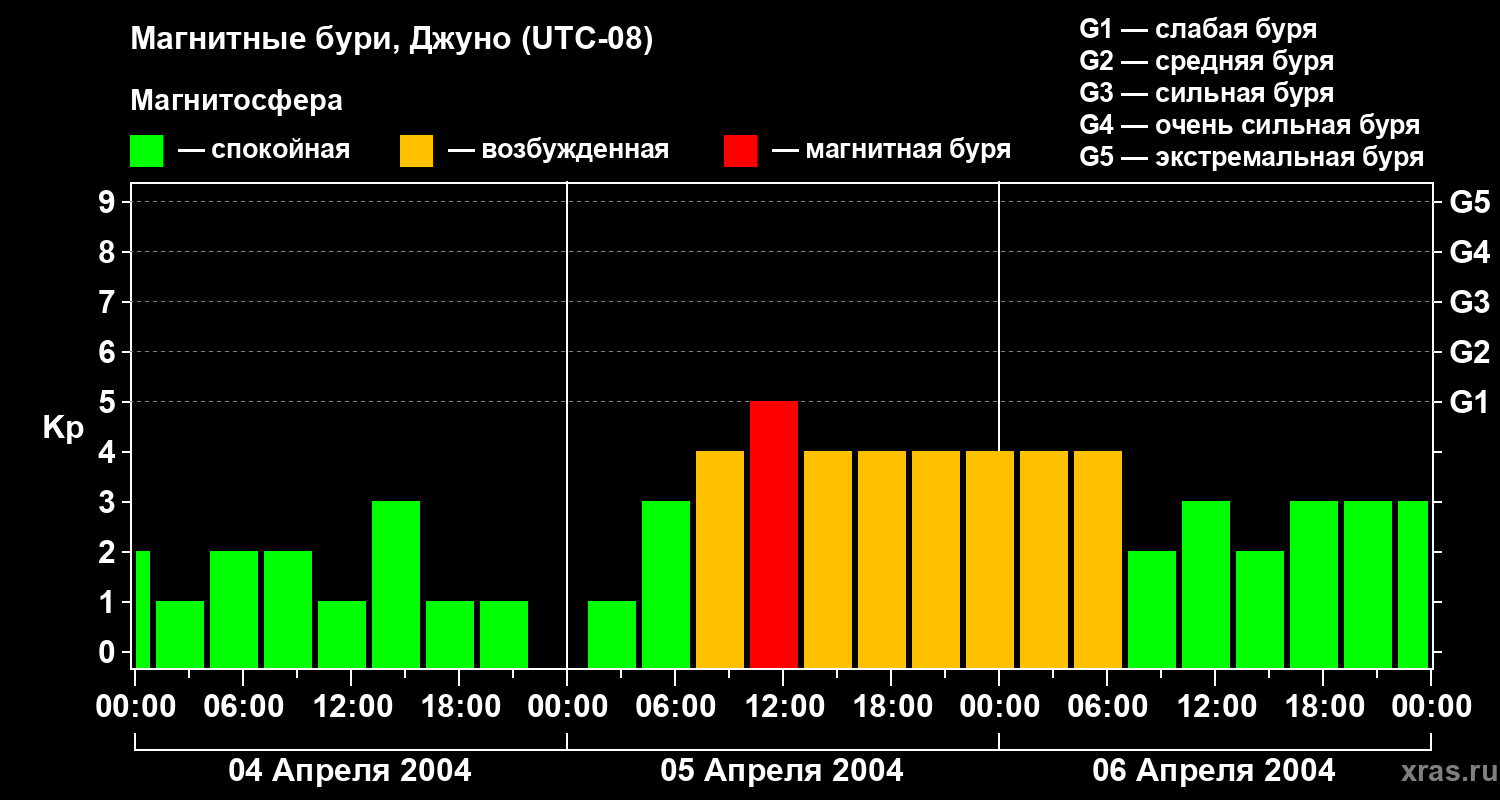Изменения геомагнитного индекса Kp с 4 по 6 апреля 2004 года для средних широт