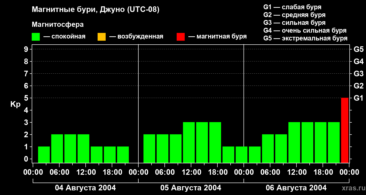 Изменения геомагнитного индекса Kp с 4 по 6 августа 2004 года для средних широт