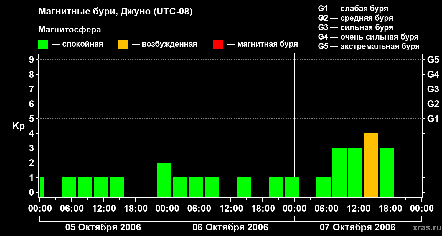 Изменения геомагнитного индекса Kp с 5 по 7 октября 2006 года для средних широт