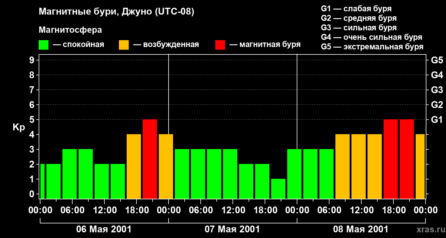 Изменения геомагнитного индекса Kp с 6 по 8 мая 2001 года для средних широт