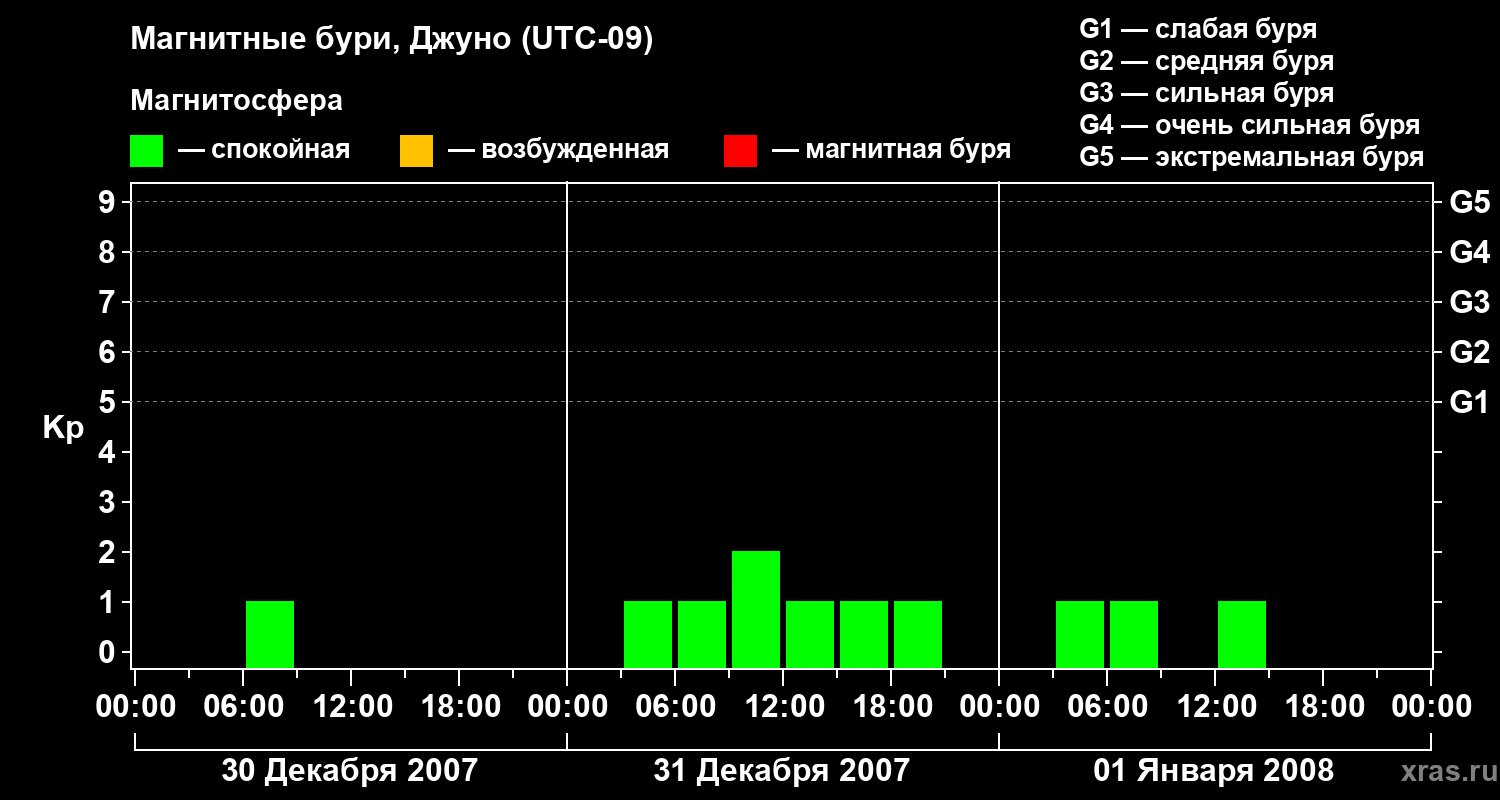Изменения геомагнитного индекса Kp с 30 декабря 2007 года по 1 января 2008 года для средних широт