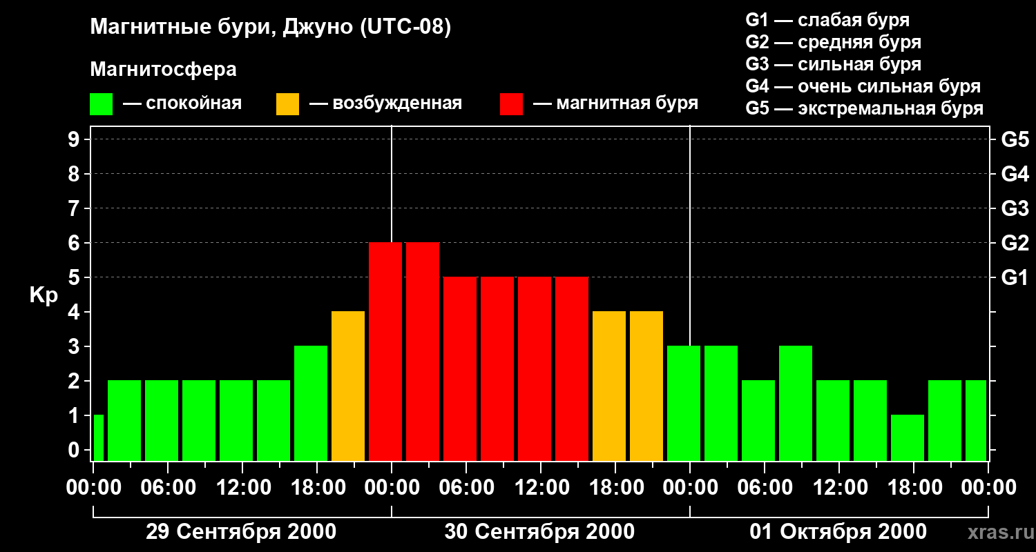 Изменения геомагнитного индекса Kp с 29 сентября по 1 октября 2000 года для средних широт