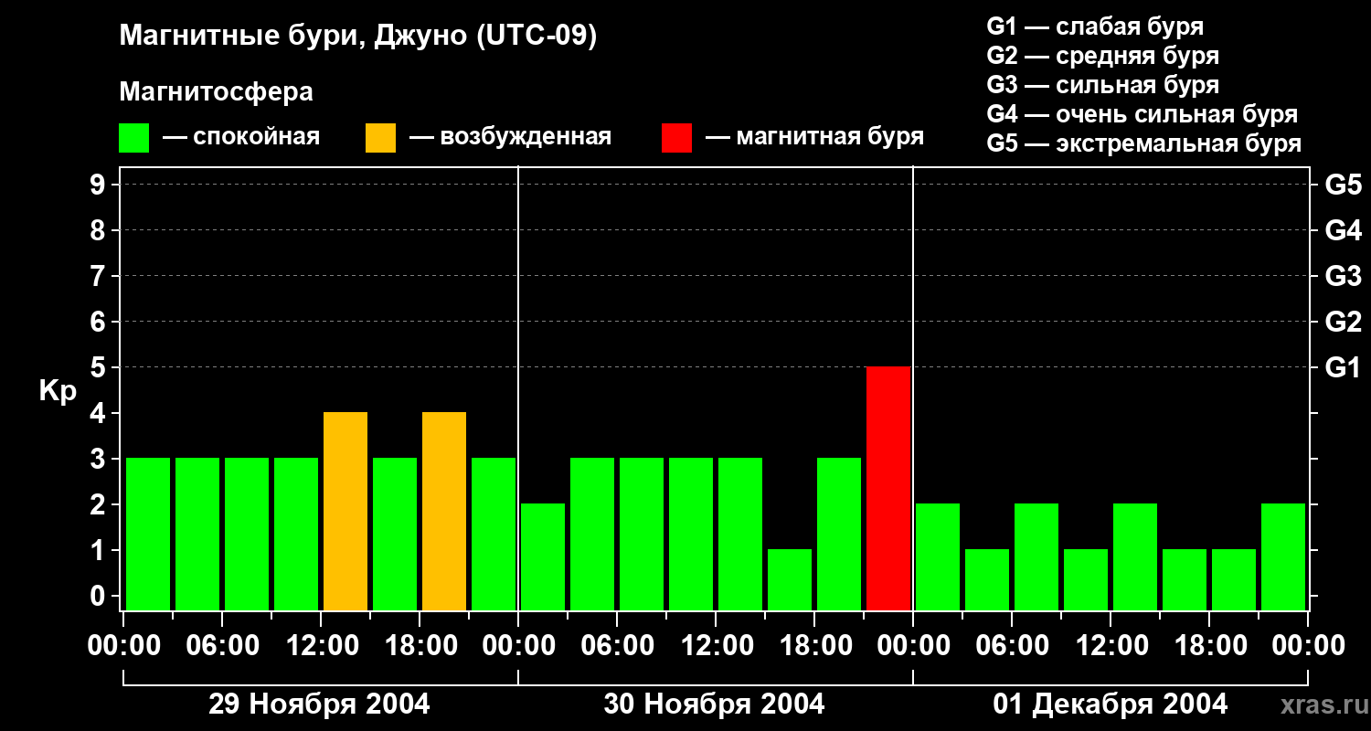 Изменения геомагнитного индекса Kp с 29 ноября по 1 декабря 2004 года для средних широт