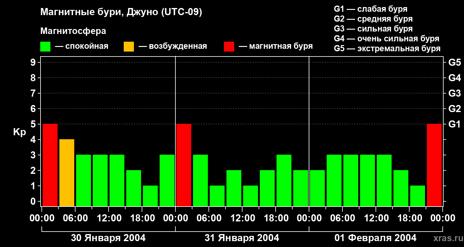 Изменения геомагнитного индекса Kp с 30 января по 1 февраля 2004 года для средних широт