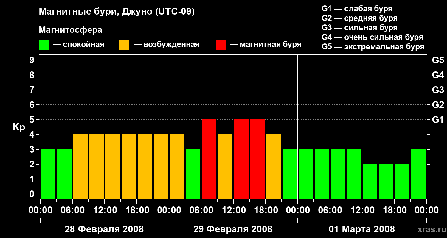 Изменения геомагнитного индекса Kp с 28 февраля по 1 марта 2008 года для средних широт