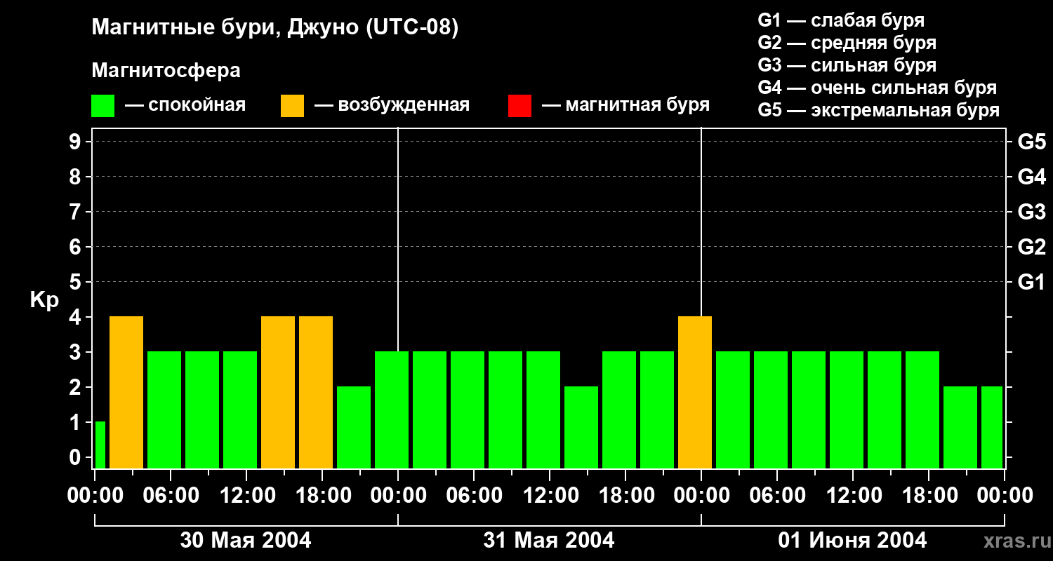 Изменения геомагнитного индекса Kp с 30 мая по 1 июня 2004 года для средних широт