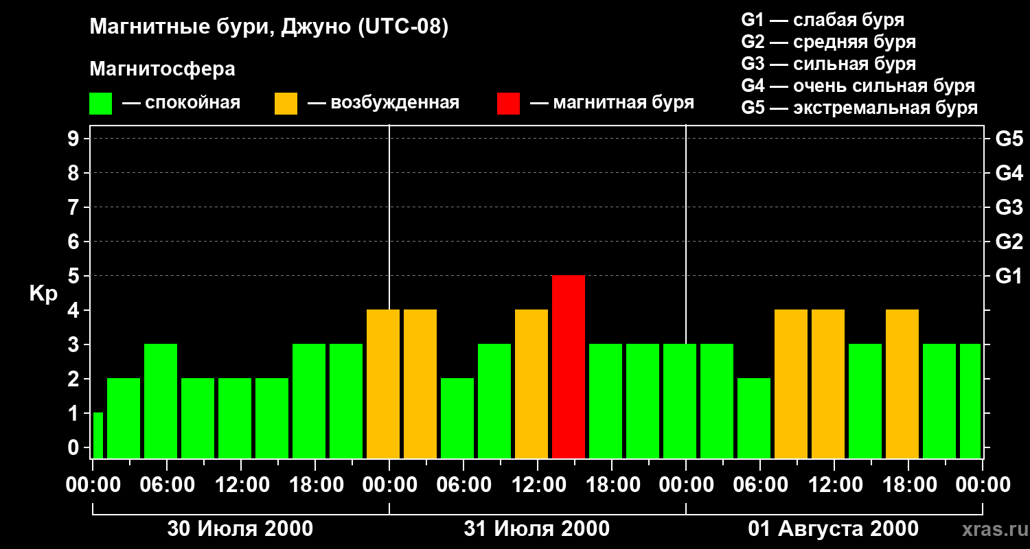 Изменения геомагнитного индекса Kp с 30 июля по 1 августа 2000 года для средних широт
