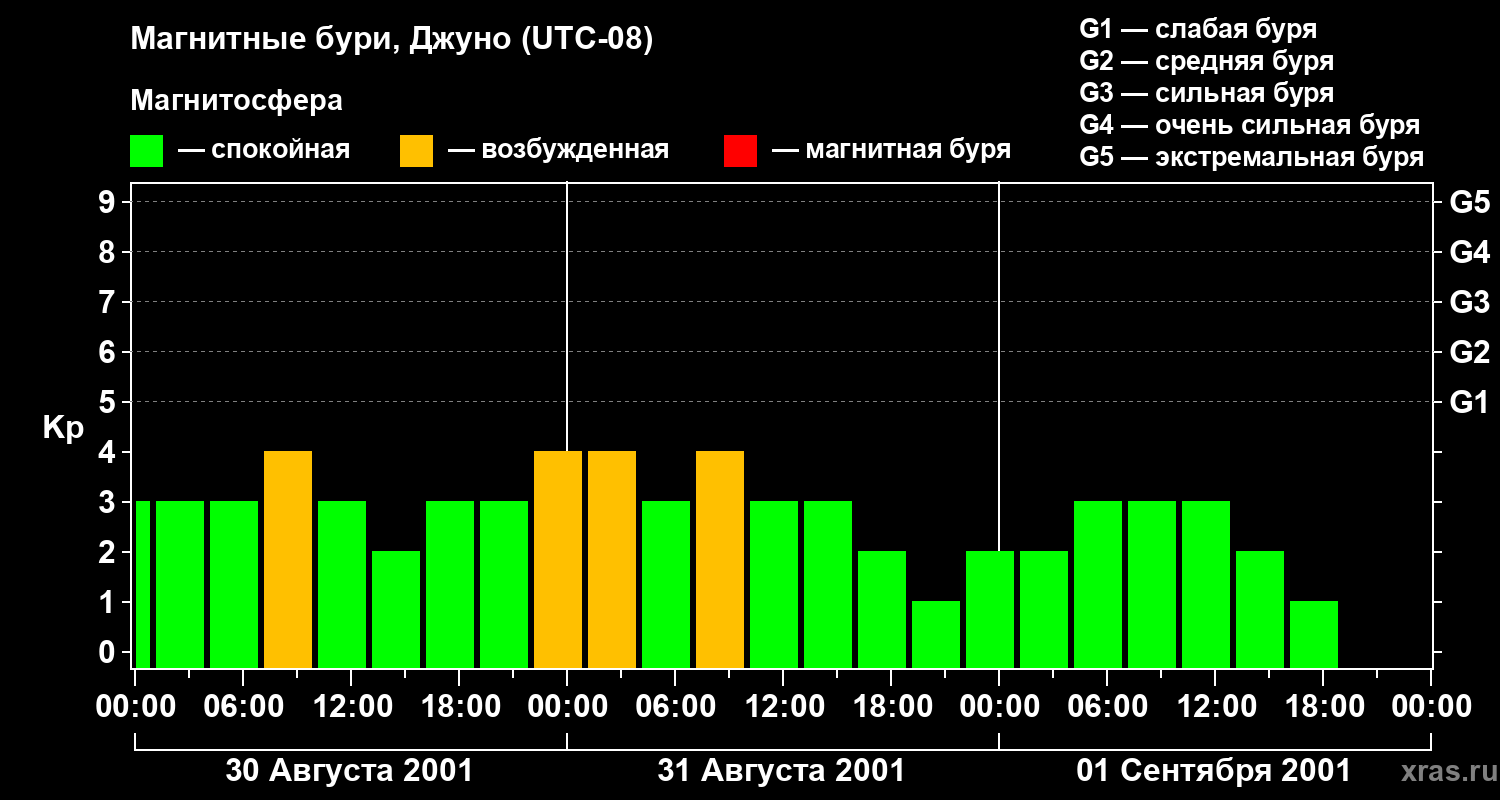 Изменения геомагнитного индекса Kp с 30 августа по 1 сентября 2001 года для средних широт