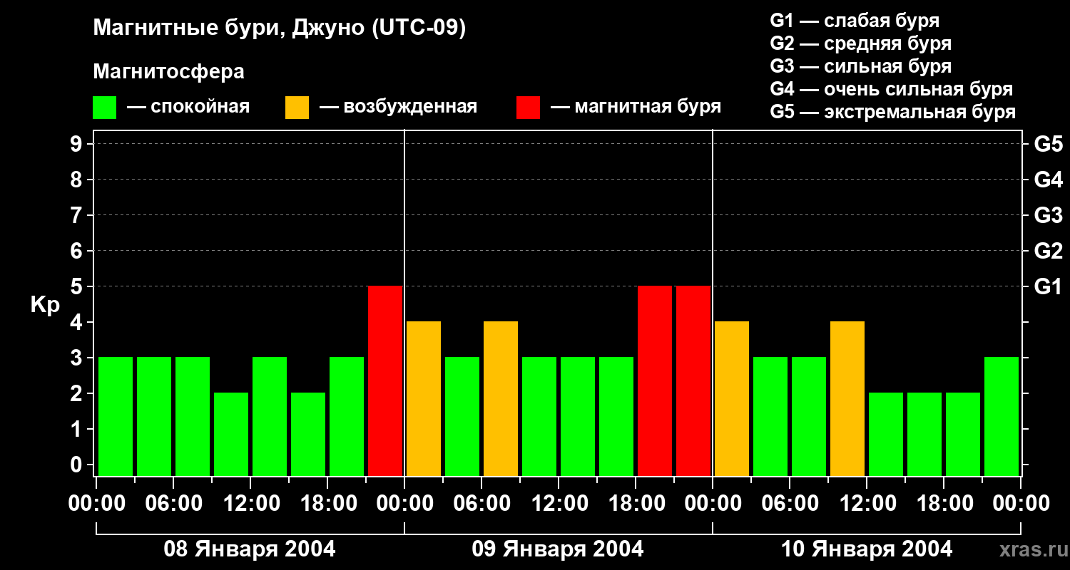 Изменения геомагнитного индекса Kp с 8 по 10 января 2004 года для средних широт