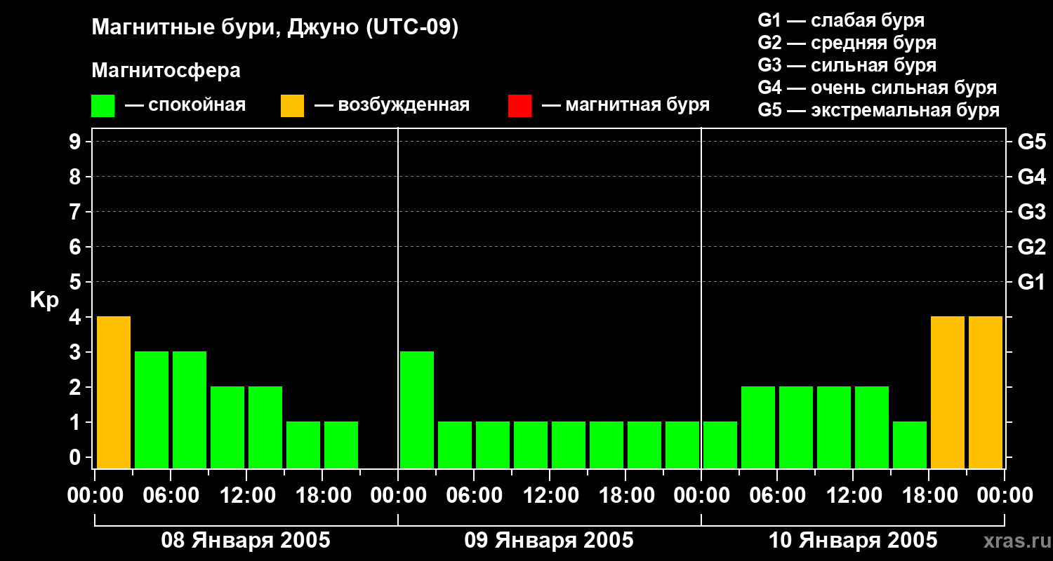 Изменения геомагнитного индекса Kp с 8 по 10 января 2005 года для средних широт
