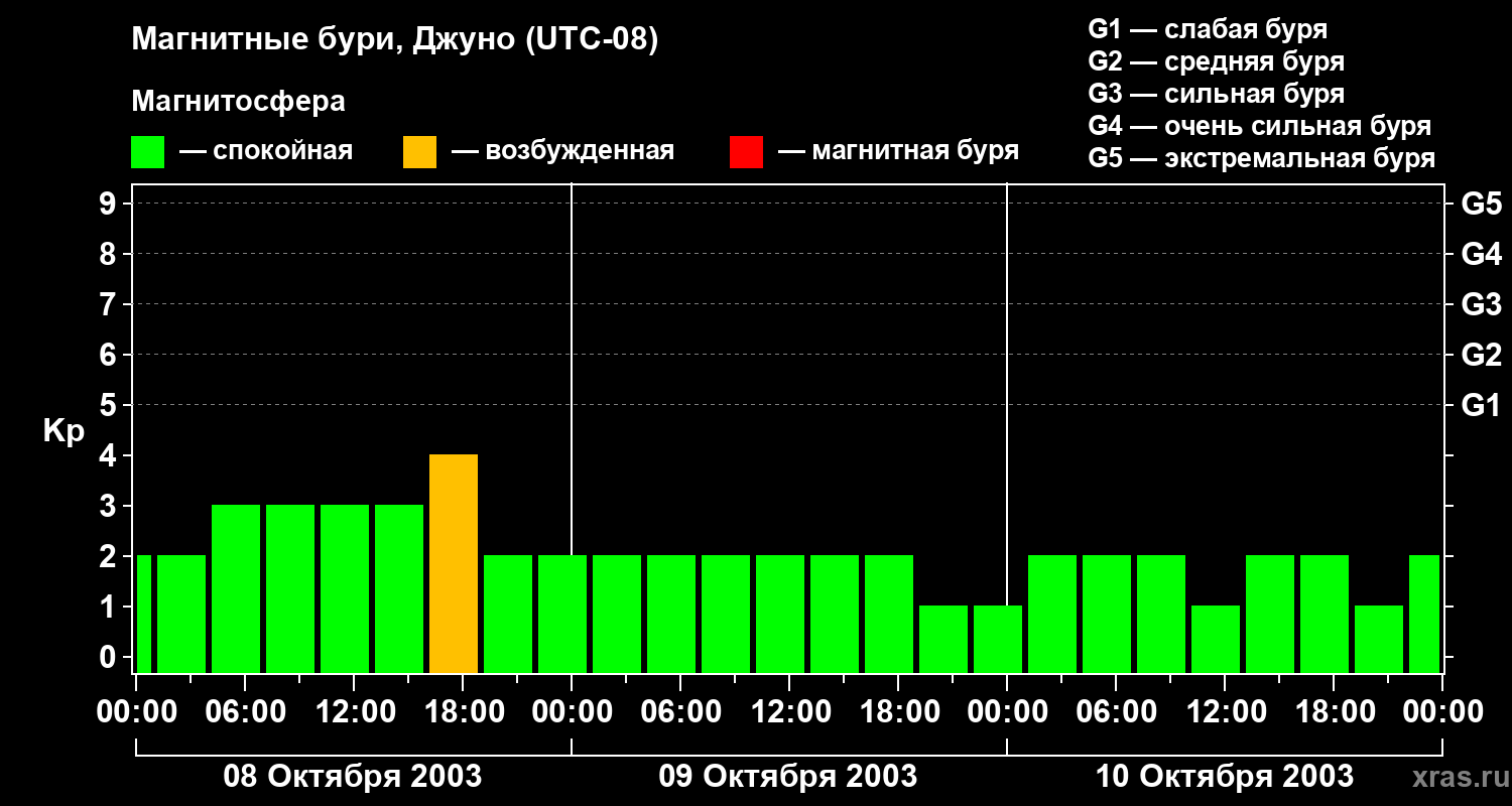 Изменения геомагнитного индекса Kp с 8 по 10 октября 2003 года для средних широт