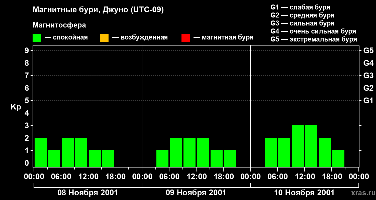 Изменения геомагнитного индекса Kp с 8 по 10 ноября 2001 года для средних широт