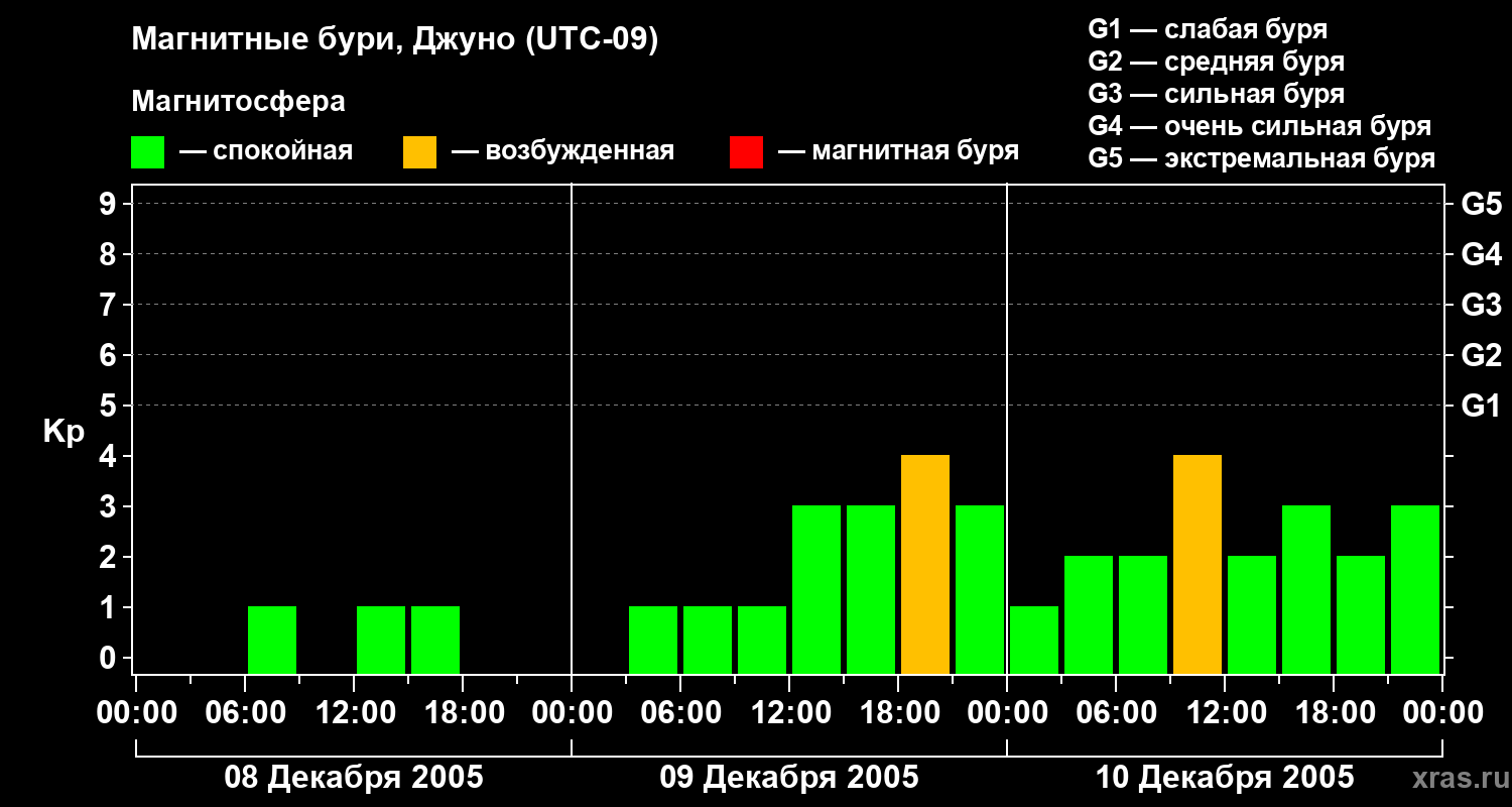 Изменения геомагнитного индекса Kp с 8 по 10 декабря 2005 года для средних широт